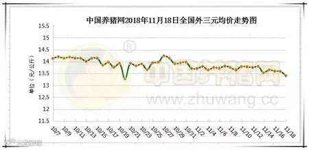 2018年11月18日,据中国养猪网猪价系统监测全国外三元均价为13.41元/公斤,较昨日下跌0.18元/公斤,较上周下跌0.37元/公斤,涨幅维持在0.01-0.65元/公斤,跌幅维持在0.02-0.37元/公斤。