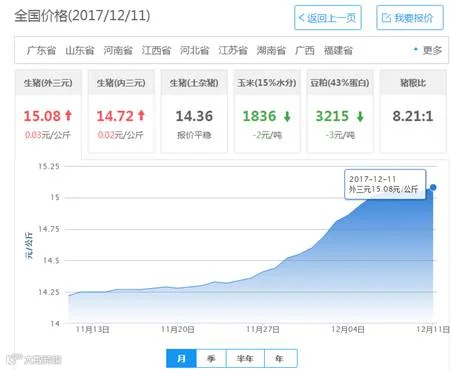 “上半年因拆迁导致部分地区适重猪源提前消化,天气转冷后消费增量,适重猪源供应趋紧。另外,西南地区腌腊逐步开启,肥猪价格走高,上游惜售情绪渐浓;二次育肥客户看涨冬至前后行情,大量购进中猪回圈育肥,生猪出栏周期人为延后。供应端缩紧,需求端放量是本次猪价上涨的主因。”分析师李晶表示。