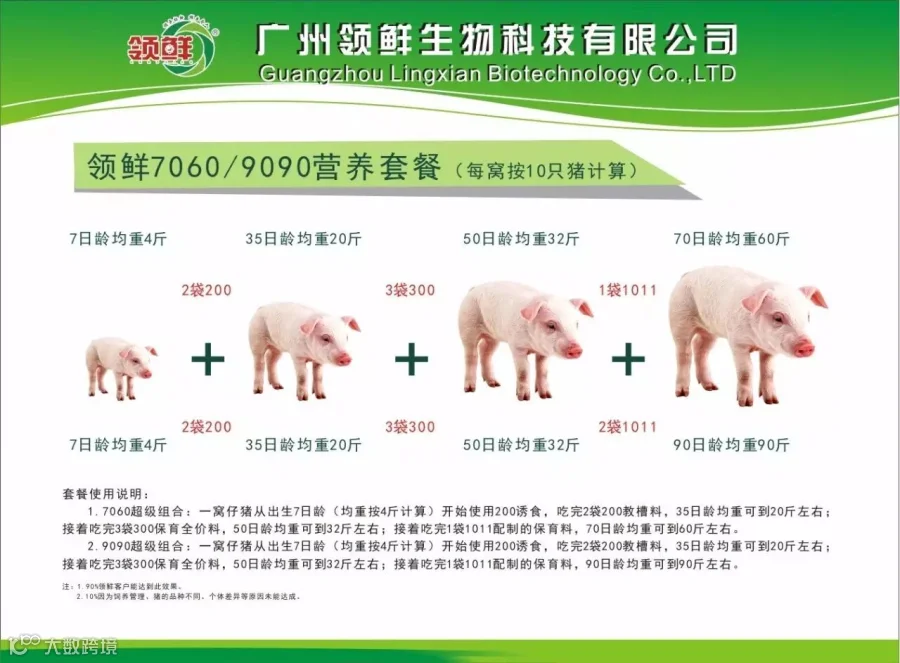 1.7060超级组合:一窝仔猪从出生7日龄(均重按4斤计算)开始使用200诱食,吃完2袋200教槽料,35日龄均重可到20斤左右;接着吃完3袋300保育全价料,50日龄均重可到32斤左右;接着吃完1袋1011配制的保育料,70日龄均重可到60斤左右。
