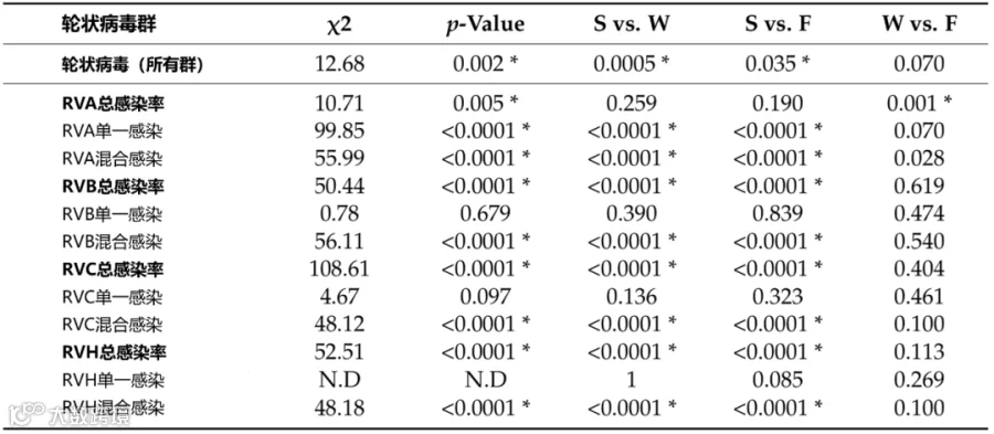 有趣的是,在我们的调查中,观察到受肠炎影响的猪的A群轮状病毒和B群轮状病毒感染率的季节性影响,根据日龄段的不同,存在一些差异。值得注意的是,哺乳仔猪的A群轮状病毒在春季达到峰值,育肥猪的A群轮状病毒在春季和秋季达到两个峰值。同样,在断奶猪群中,B群轮状病毒在春季和秋季达到峰值,而在育肥猪中,B群轮状病毒在春季和秋季之间稳步增加。相比之下,C群轮状病毒和H群轮状病毒似乎没有受到季节变化的影响。有趣的是,在仔猪中,轮状病毒感染率与肠炎数量之间存在相关性,表明肠炎数量与轮状病毒感染率之间存在关联。相反,在断奶和育肥猪中,轮状病毒感染率与我们诊断实验室报告的肠炎数量不匹配,表明轮状病毒在大日龄猪的肠炎病因中起次要作用。先前研究发现A群和C群轮状病毒的感染曲线并没有出现任何季节性峰值。同样,2009年至2011年进行的一项多层次模型研究考虑了地理位置和日龄等影响因素,报告了A群轮状病毒和B群轮状病毒感染的波动。可能其它因素,如混合感染的存在,在不同季节和不同日龄段猪只中表现出与轮状病毒不一样的易感性。