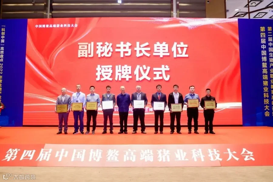 中国博鳌高端猪业科技大会组委会首任轮值理事长李职先生为组委会副秘书长单位颁牌。