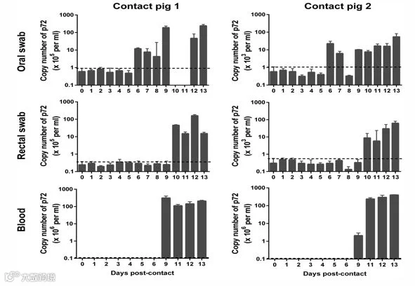 非洲猪瘟病毒在人工肌肉接种的情况下,3天即可在血液中检测到病毒,随后是唾液和粪便。而临床上非洲猪瘟的感染往往是通过物理性传播和消化道接触,同居感染试验更有说服力。同居感染实验结果显示,非洲猪瘟自然感染情况下病毒最早出现在唾液中,较血液中出现病毒载量早3天,因此建议在无症状猪群定期排查时使用唾液作为检测对象。猪群一旦出现不吃料、减料、轻微发热等疑似发病症状,可以采集唾液、鼻腔液、肛拭子等混检,也可以同时采集耳血拭子,有助于疫情的提早发现。如果在血液中检测到了非洲猪瘟病毒,说明猪场很有可能已经较大面积感染非洲猪瘟病毒。