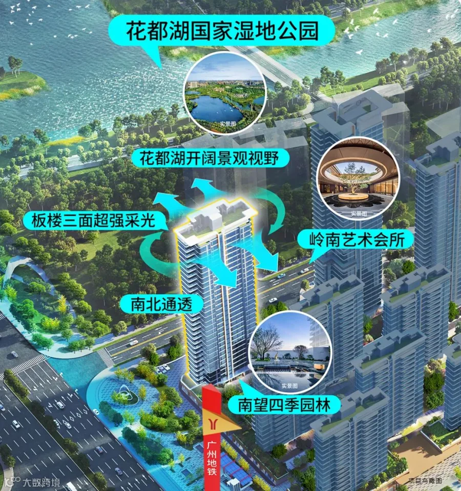 项目坐落于距花都湖仅约150米的珍贵土地上(直线距离:数据来源于百度地图),全盘T2纯板式设计本就以通透格局与南北对流著称,1栋作为全盘的楼王,更将这片花都湖天赋发挥到极致。