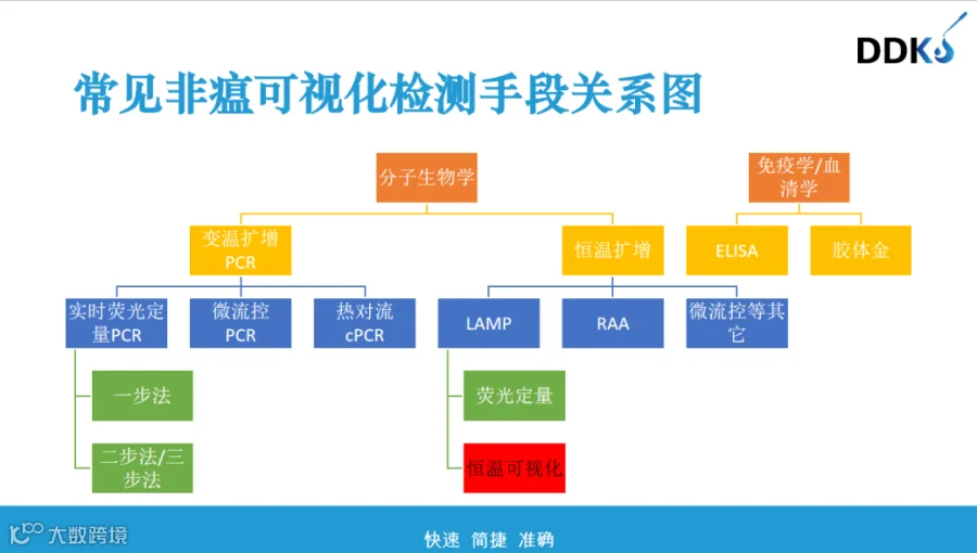 答:目前主要有血清学及分子生物学检测两类。分子生物学检测更准确、高效,分子生物学检测应用较多的是变温PCR(聚合酶链式反应)及等温扩增技术。我们要根据自己实际进行选择,做好平行比对。