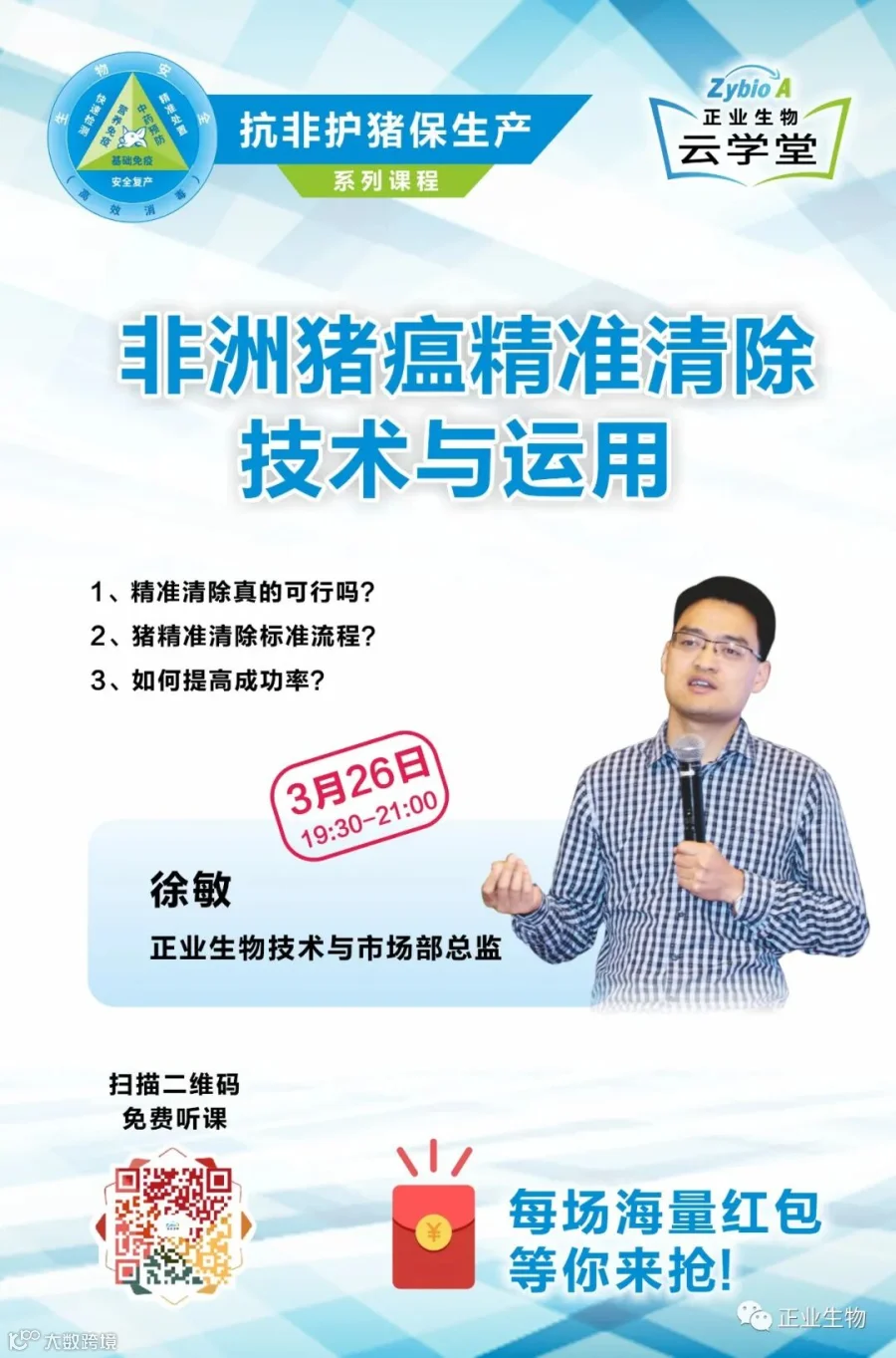 3月12日正业生物云学堂进行了“抗非四式 护猪三招”第二课,由北京中农快检公司副总经理刘建兴针对《非洲猪瘟的检测技术与运用》做了详实的讲解。