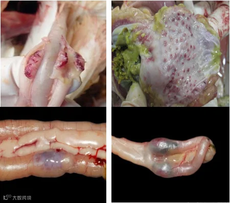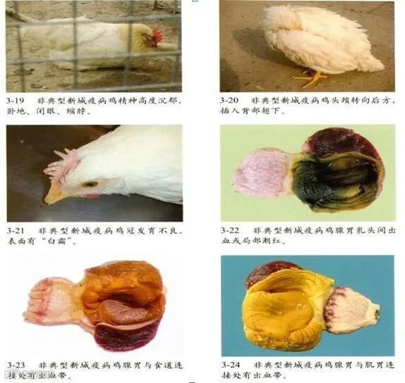 经典症状多见于未免疫鸡群,少见;非典型症状增多,与日龄密切相关;雏鸡和育成鸡剖检变化较典型。胃肠道不同程度的出血和呼吸道有粘液为主要表现。产蛋鸡:多伴有卵黄性腹膜炎,需多剖检一些病鸡才能得出明确印象。