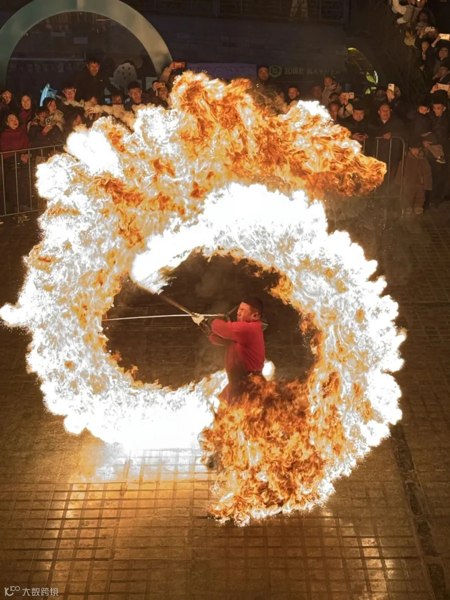 这张的张力直接 “炸” 开!旋转的火圈裹着金白焰光,表演者红衫在焰色里更利落,连观众举手机的劲儿,都把现场热烈感传出来了。