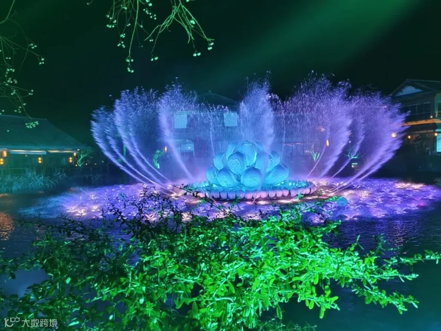 夜景喷泉像把梦境搬进了现实!莲花造型配紫蓝灯光,水花炸开的弧度裹着流光,朦胧又惊艳,把夜色里的浪漫和巧思都装进去了。