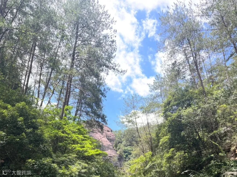 抬头撞见的山林清爽感!高树撑着蓝天,连风里的绿意都快从镜头漫出来,看着就凉快又舒展。