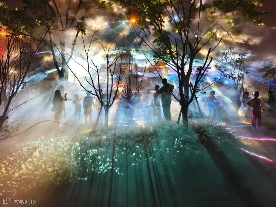 烟雾裹着彩光,连树影都飘着梦幻气,像把童话揉进了夜色里 —— 这氛围感,看得人都想钻进画面晃一晃。