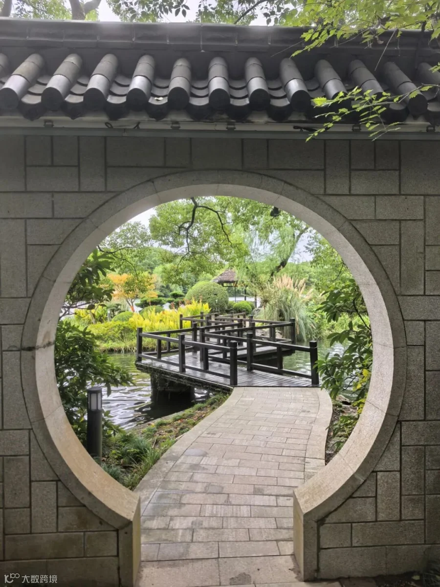 这月洞门简直是天然画框!把亭台水榭、满院绿意都框得恰好,中式园林的雅致劲儿一下就撞进眼里了。