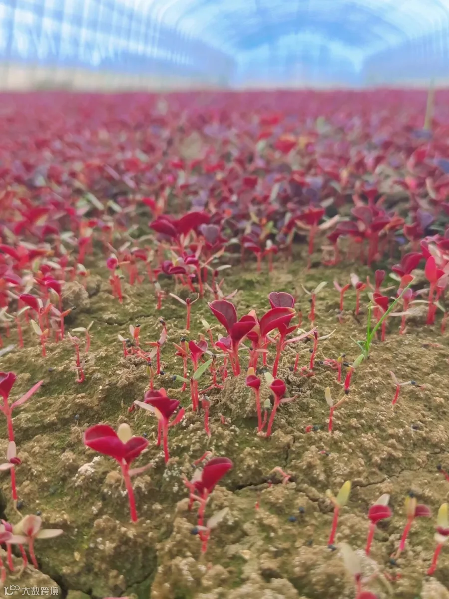 大棚里这一片艳红太戳眼!嫩红芽叶挤得热热闹闹,泥土里裹着蓬勃劲儿,像把春天的热烈揉进了这方小天地。