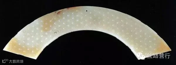 五、谷纹玉璜(珩):体扁平,呈三分之一圆形,器表雕琢谷纹,有阴刻线边阑。