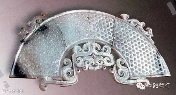 体扁平,半璧形,外缘有扉牙。器表饰谷纹,有凹弦纹边阑。弧背缘部外侧出廓镂雕左右对称的两凤鸟,弧腹缘部内侧出廓镂雕舒卷流畅的对称几何云纹。
