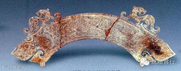 体扁平弧状,两端镂空成龙首形,躯体简化呈卷云纹,略显浮雕状。另一件透雕四龙,两侧的两龙,首朝外,卷身如“S”形,中间的二龙相互缠绕。表面细刻模糊线纹。