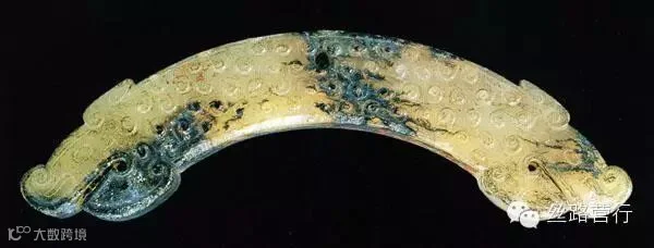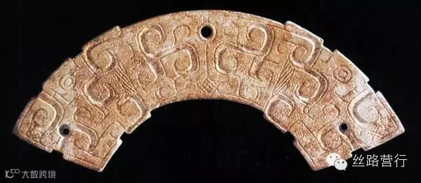 扁平体,短弧状,两端以龙首形构外廓雕琢有浅短方折型扉牙,龙首嘴微张,上下吻宽厚基本雷同,椭圆眼,卷鼻,短耳后竖,耳下置一组短斜阴刻线构成的短棒状纹。龙身饰简化成大“S”形的宽大龙首纹,间填衬细阴刻线卷云纹、网格纹等。