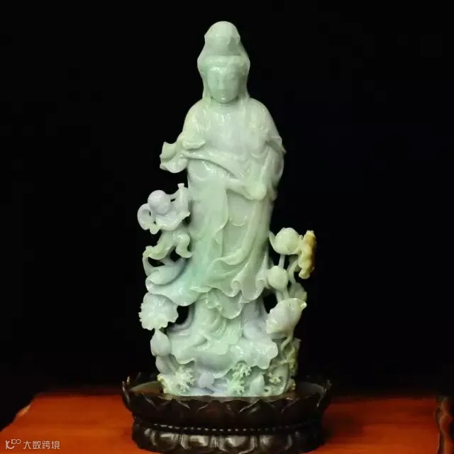 观音菩萨为西方三圣之一,具有无量的智慧和神通,大慈大悲,普救人间疾苦。以翡翠的色泽、质地、透明度和纯净度来衬托观音菩萨的慈悲,是非常适合的。
