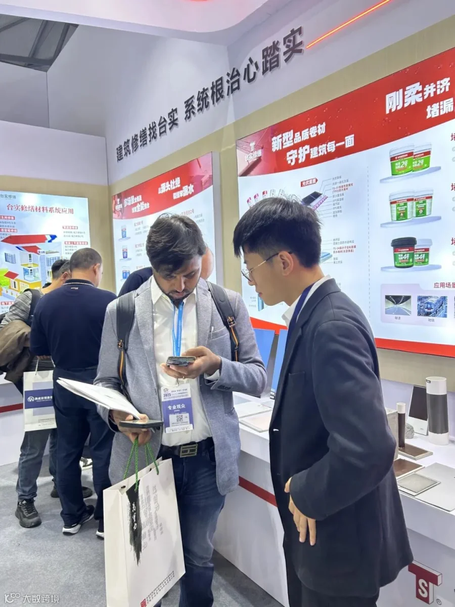 通过图文灯箱、样品展示与现场讲解相结合的方式,向每一位驻足者细致介绍修缮系列材料(包含堵漏加固系列、高强密封系列、强力修复系列)的优势:聚焦“高效便捷”需求,具备粘结力强、止水效果优、施工便捷、耐候环保等特点,为老旧建筑防水维修提供一站式解决方案。