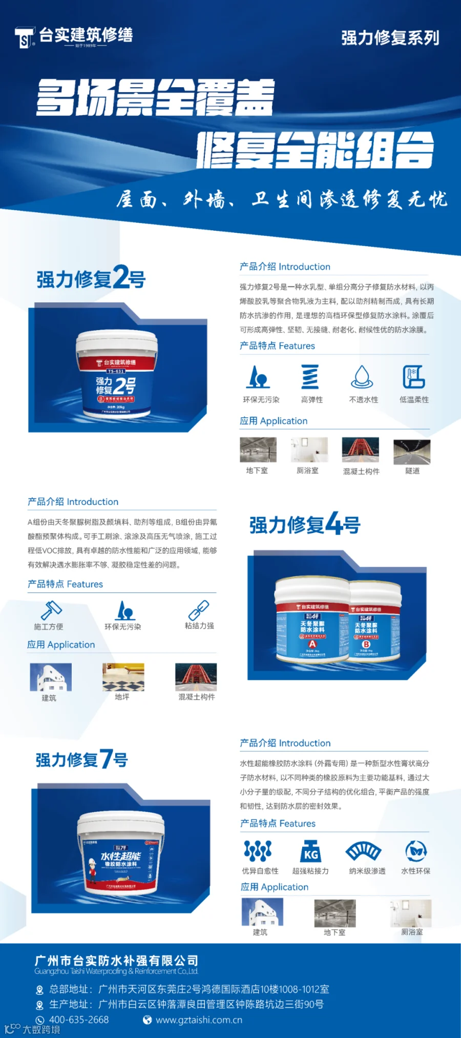 作为源头工厂,台实主要生产建筑防水、灌浆堵漏、补强加固、环氧地坪等绿色环保、品质优异的建筑材料,从材料研发到生产落地,每一款产品都经过严苛的性能测试与实地验证。我司通过了ISO9001、ISO14001、ISO45001、GB/T50430、十环、CTA品质等体系认证,高质量的产品广泛应用于市政、交通、民商用及工业建筑领域。