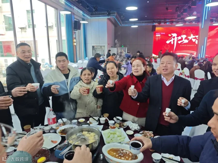 中午时分,公司精心准备了丰盛的开工饭,台实董事长邓总举起酒杯,向全体员工致以诚挚的祝酒词,希望大家在新的一年里能够以更加饱满的热情、更加坚定的信心,迎接新的挑战,并邀请中高层领导上台与全场举杯共庆这一重要时刻。