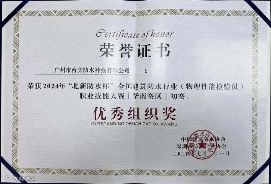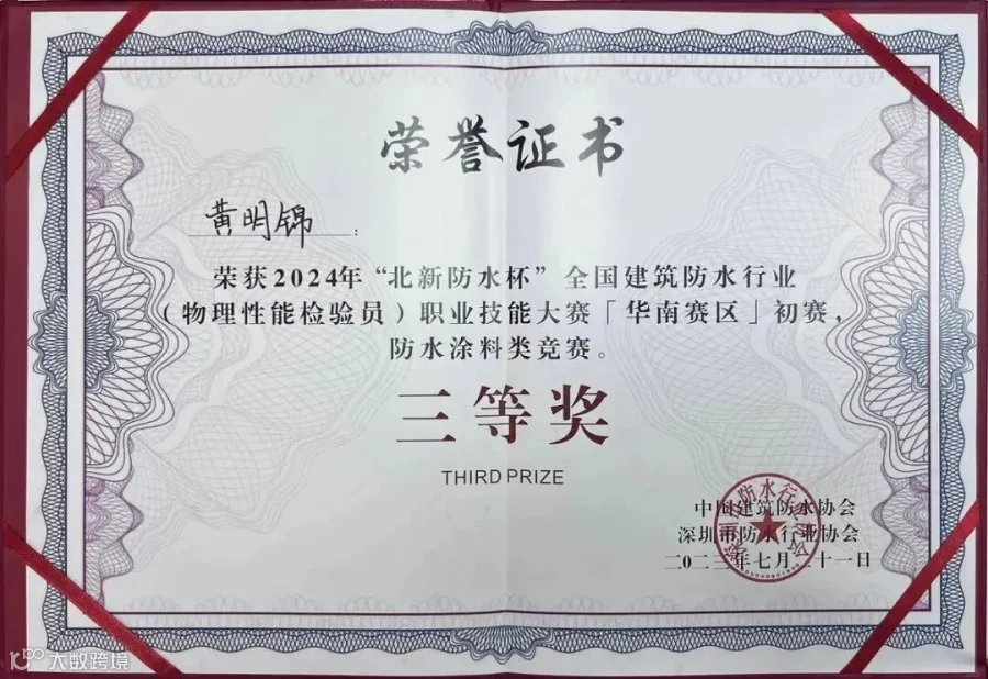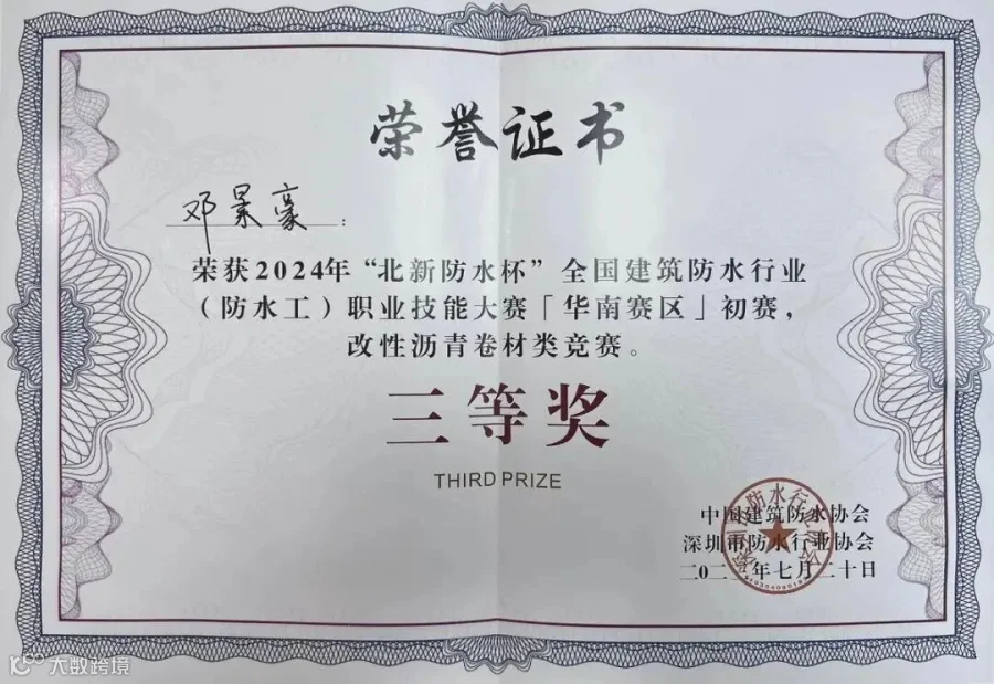 在2024年全国建筑防水行业职业技能大赛(华南赛区)初赛中获奖