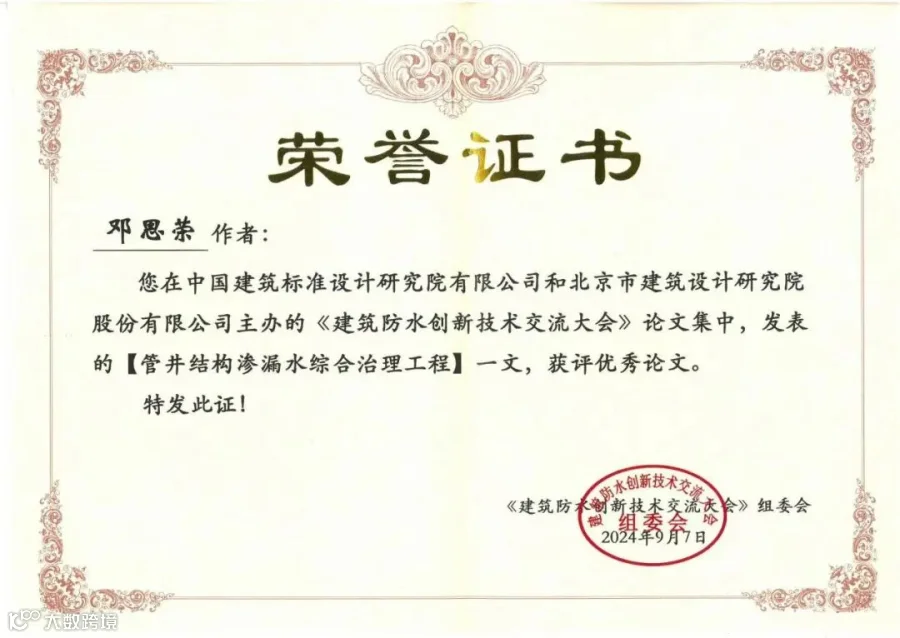 【荣誉资质】企业喜讯|台实在“建筑防水创新技术交流大会”中荣获优秀论文奖