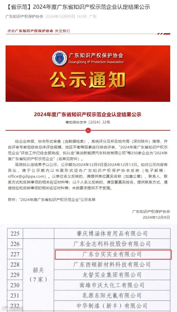 荣获“2024年度广东省知识产权示范企业”称号