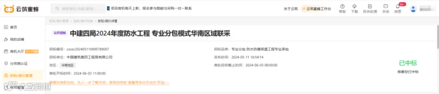 2、中标中建四局2024年度华南区域防水工程专业分包集中采购