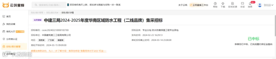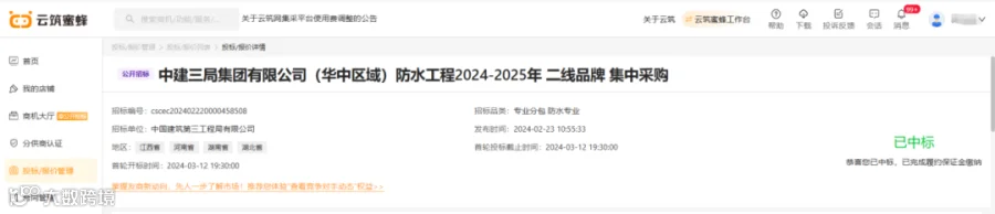 3、中标中建三局2024-2025年度华南区域、华中区域防水工程集中采购