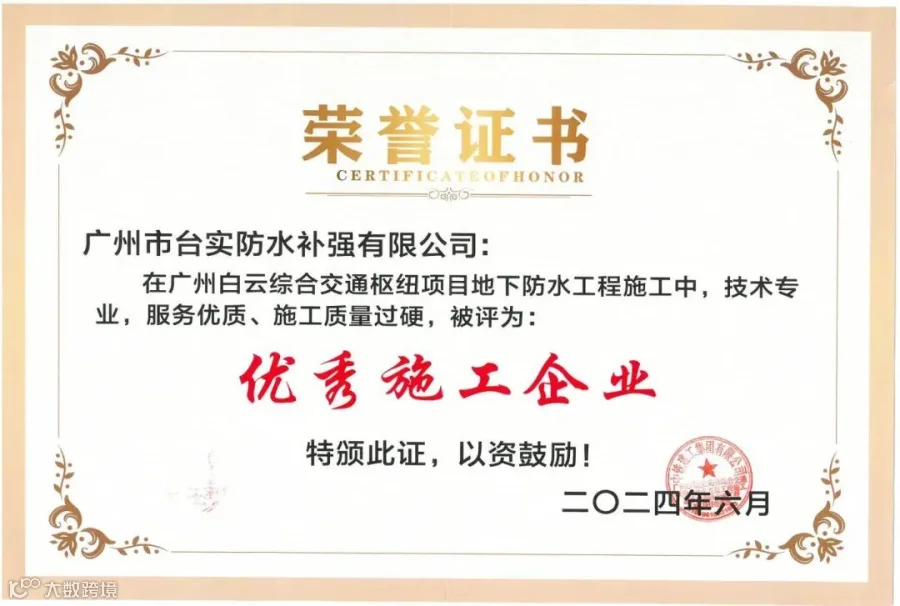 【荣誉资质】祝贺台实在广州白云棠溪综合交通枢纽项目中荣获中铁建颁发“优秀施工企业”殊荣!