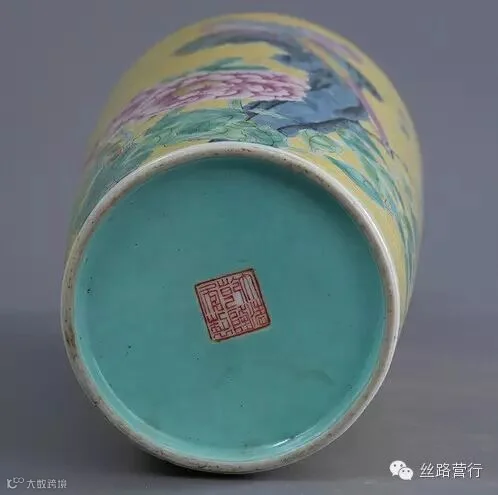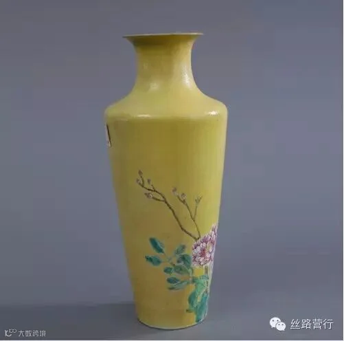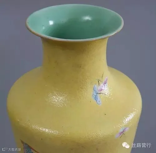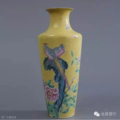 该器物黄釉为底暗刻花,内施浅蓝釉。上绘牡丹锦鸡石,牡丹花开,雍容华贵,锦鸡身姿卓韵,五彩斑斓. 尽显皇家气派。此观音瓶造型简洁,线条流畅, 有吉祥幸福之意.是精美的收藏品。