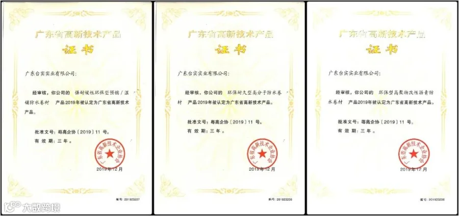 台实作为一家高新技术企业,在建筑防水、修缮行业耕耘三十年,致力于建筑防水修缮产品的研发与生产。多年来,台实以创新来驱动企业的发展和突破,拥有多项发明、外观设计专利和大批自主知识产权的产品,为业界提供了源源不断的创新力量,更为台实的产品创新提供了持久的核心竞争力。