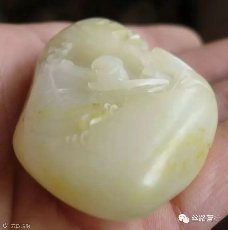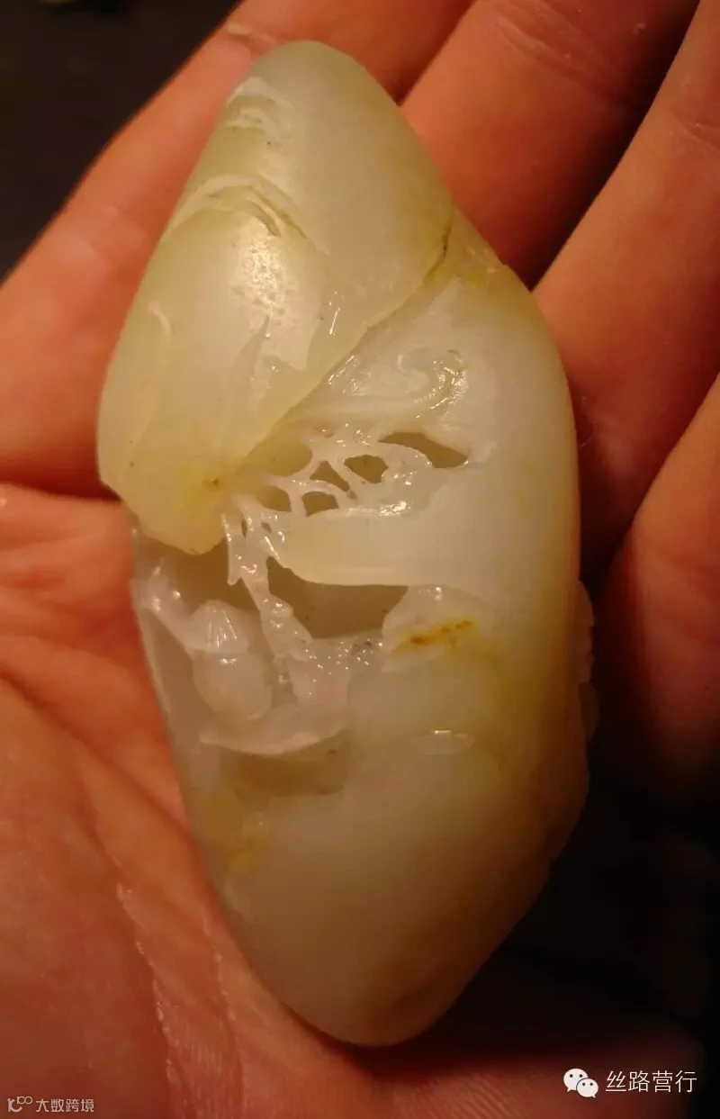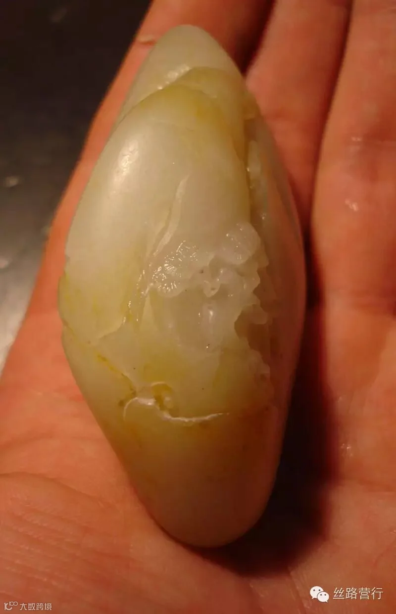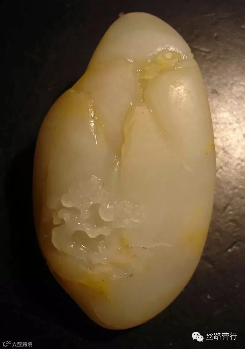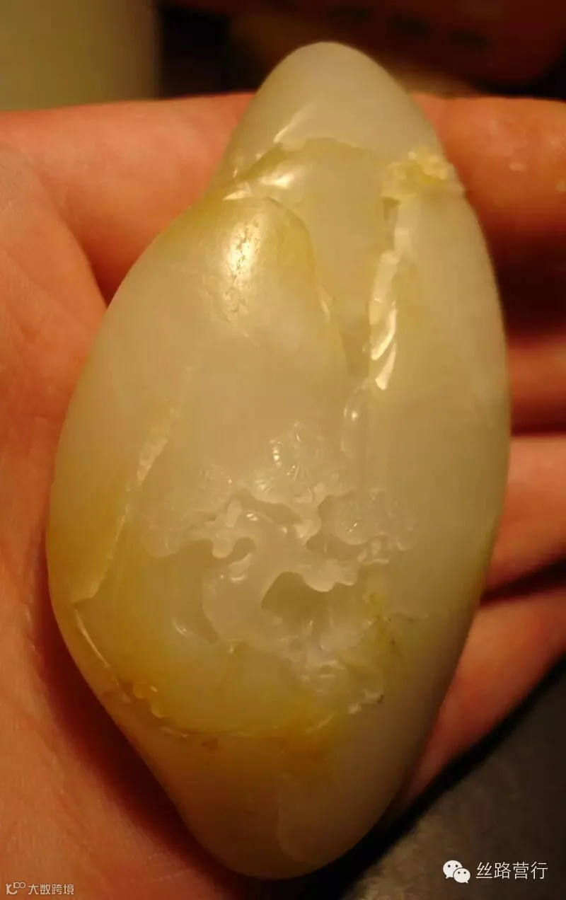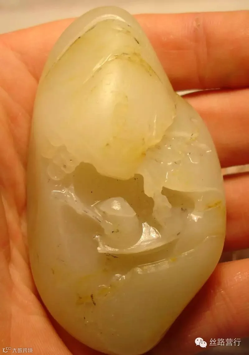 这是一块绺裂比较多的籽料,挂淡淡的黄皮,质不错,但必须施以雕工才可体现其拥有的价值。如若顺裂切开,就会细碎的不值一钱;如果将绺裂尽数挖去,又会破坏完整的料形。 办法只有一个:“借”!借裂为纹,挖脏遮绺。