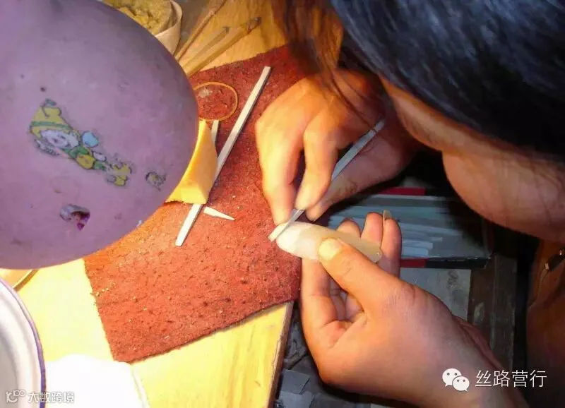 大家知道,玉料的硬度是较高的,而钻粉磨头的磨削力也是相当强的,两者相磨就会产生高温及火花。因此水在玉雕过程中是必不可少的。它既有降温的作用,也起到了润滑介质的功能。图片上方的针头就是滴水的。