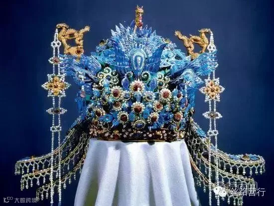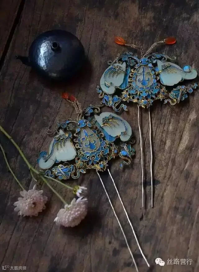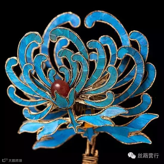 点翠是我国传统的金属工艺和羽毛工艺的完美结合,先用金或镏金的金属做成不同图案的底座,再把翠鸟背部亮丽的土耳其蓝色羽毛仔细地镶嵌在座上,制成各种首饰器物。