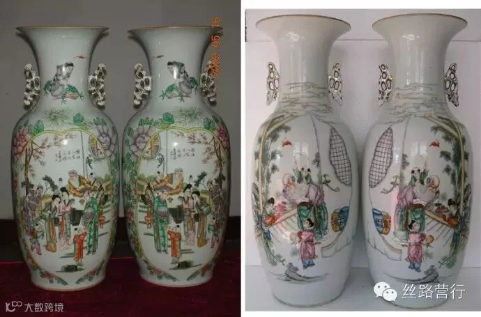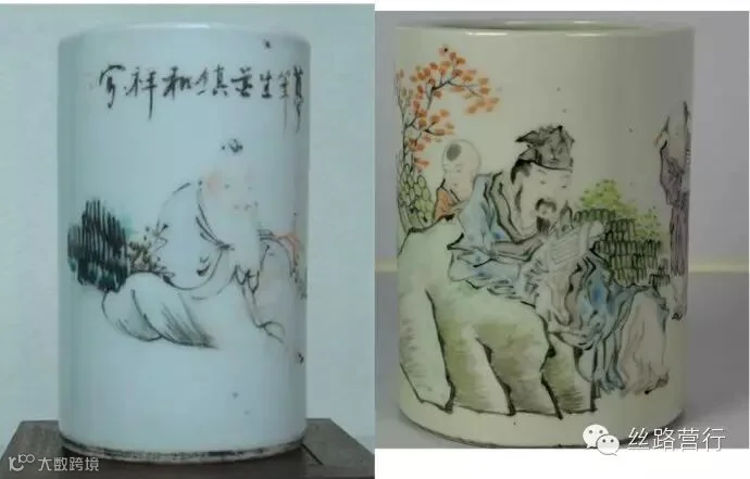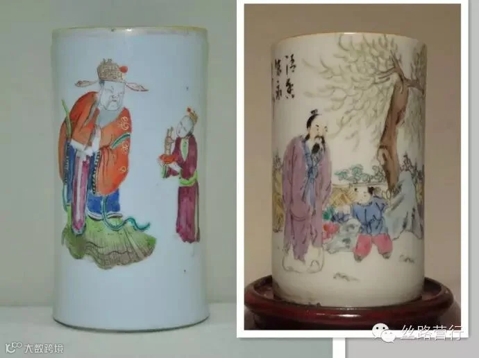 (上图左为清代粉彩笔筒真品,右为现代仿品)