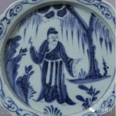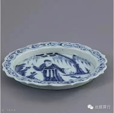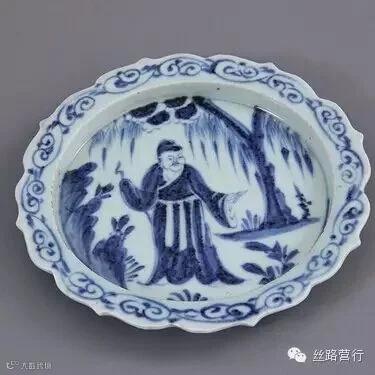 盘折沿,菱口,浅腹平底。折沿处饰卷草纹,盘内以青花绘柳树、花卉,其间站立一人物,宽额大脸,正观花赏景。该藏品釉面莹润、胎釉紧密,造型饱满庄重。青花色调明艳,呈宝石蓝色而带黑色斑点,表明使用的是外来苏麻青料。画笔流畅,构图繁而不乱,既突出了主题图案,又增加了画面的层次感。