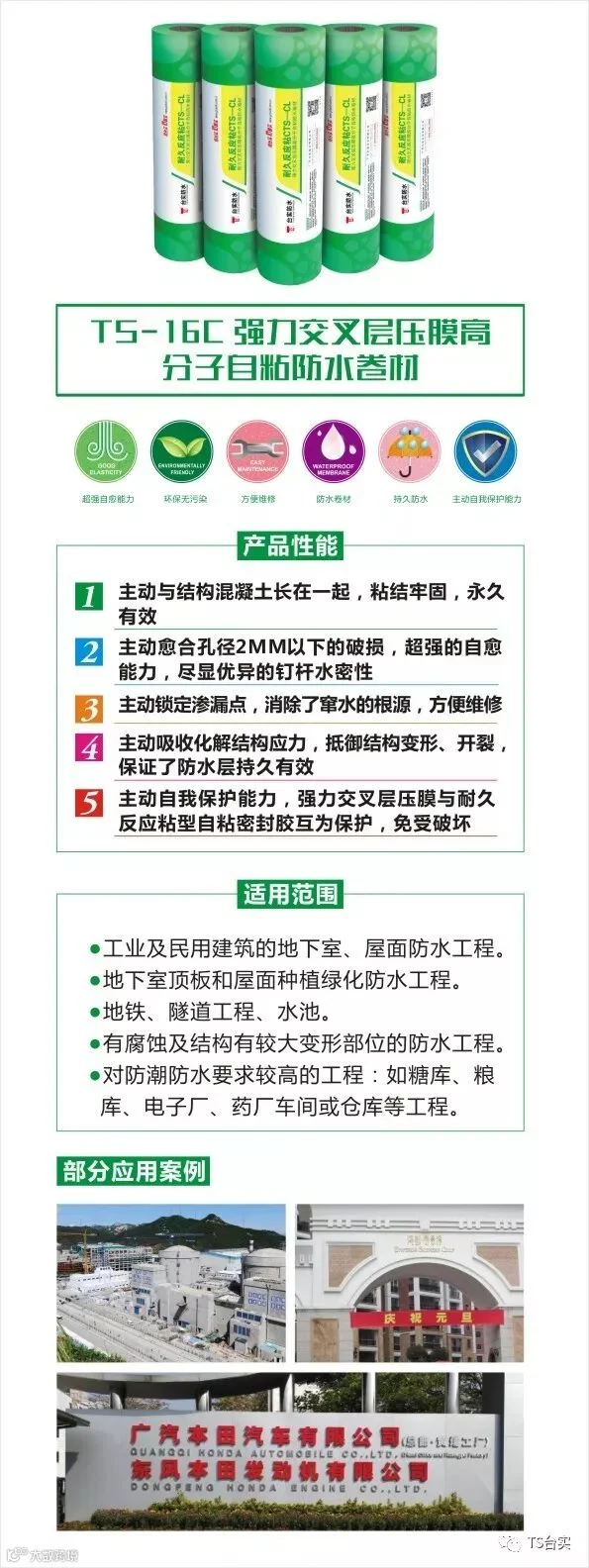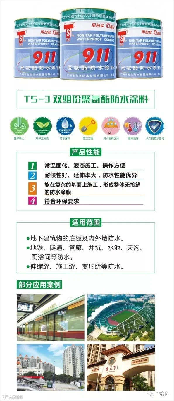 注:“双组份环保型聚氨酯防水涂料”所对应的产品为台实防水产品手册里“TS-3双组份聚氨酯防水涂料(911)”,“单面反应粘高分子防水卷材”所对应的产品为台实防水产品手册里“TS-16C强力交叉层压膜高分子自粘防水卷材”这两款产品,如由此给您带来的不便,敬请谅解!