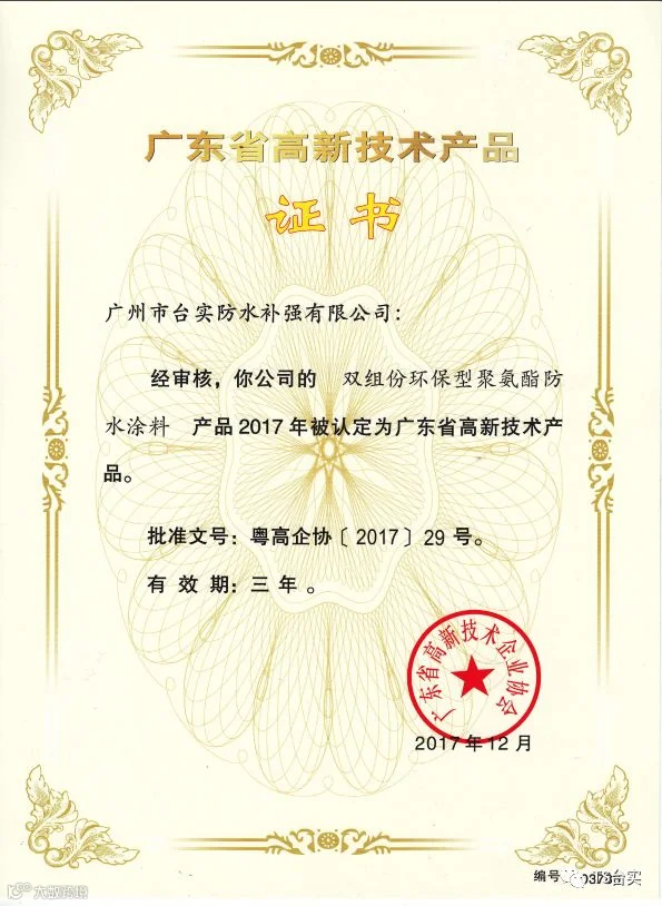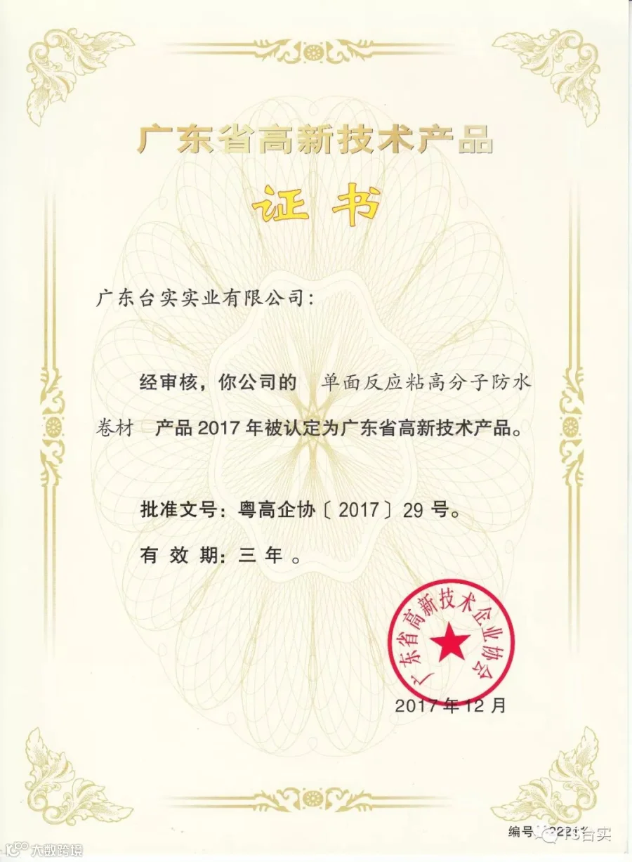 3月14日台实“双组份环保型聚氨酯防水涂料”和“单面反应粘高分子防水卷材”双双荣获的“广东省高新技术产品”证书下发到企业,这份殊荣是对台实产品的肯定,沉甸甸的值得台实人骄傲!