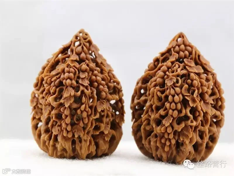 文玩核桃中还有一些带雕工的核桃,借助核桃的天然纹路,通过人工的修饰,更具有观赏性。雕刻人物通常用白狮子头,麒麟纹核桃雕山水较好。一对直径较大、雕工较好的核桃,价格均能上千;镂空的核桃价格则能达到数千甚至上万元。