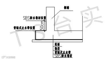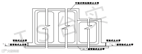 中埋式钢边橡胶止水带沿底板、侧墙、顶板兜绕成环设置,钢板止水带水平安装时(底板和顶板)呈盆形安装,以防止止水带下面存有气泡,形成渗水通道。