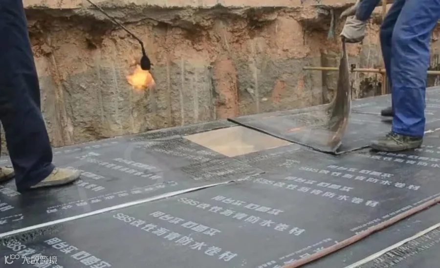 SBS弹性体沥青为基料,以聚乙烯膜、铝箔为表面材料或无膜(双面自粘),采用防粘隔离层的自粘防水卷材。该防水卷材有超强的粘接强度,特制的橡胶自粘层可保证卷材与基层、卷材与卷材的粘结密封,形成整体的密封防水层。其工艺流程如下:基层表面清理、修补→涂刷配套的基层处理剂→节点部位粘贴→定位、弹基准线→铺贴自粘性橡胶防水卷材→辊压、排气→收头处理及搭接→组织验收→保护层施工。