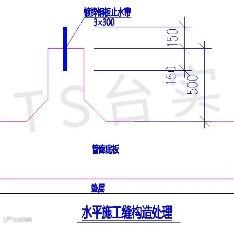 (1)本管廊纵向设置一道水平施工缝,位置在底板往上35cm处。水平施工缝新旧混凝土交接面应清除垃圾;水平施工缝埋设3厚300宽镀锌钢板止水带,钢板止水带须定位牢固,保证止水带预埋线型及高度。镀锌钢板连接采用搭接焊,保证止水效果。