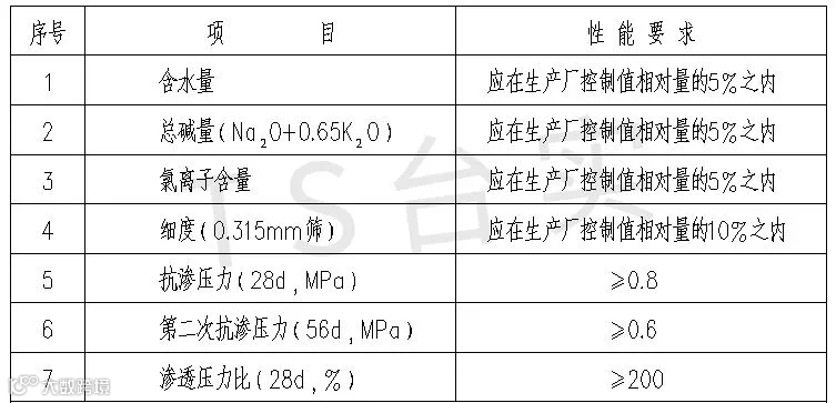 (2)所有施工缝接缝面均需涂布水泥基渗透结晶型防水涂料,用量为1.5kg/m。涂刷防水涂料前将施工缝混凝土表面浮浆和杂物清理干净,露出新鲜混凝土,然后涂刷防水涂料,其材料性能应符合下表要求: