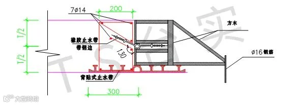 将钢边橡胶止水带插入定位钢筋中间的凹槽内,防止止水带上、下移动,同时通过通过方木、竹胶板加紧止水带,使止水带与模板支撑系统形成一个整体,防止钢边橡胶止水带左右移动,可以保证止水带的位置正确、固定牢固而不损伤止水带。见图1-1、
