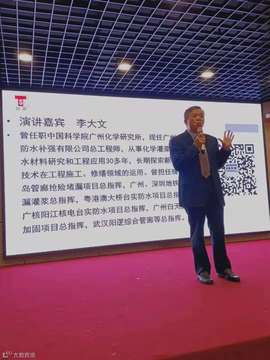 本次交流观摩会以“隧道与地下工程建造技术创新”为主题,就国内隧道与地下工程领域的前沿研究进行广泛深入的学术交流。会上,台实总工程师李大文上台做了关于“化学灌浆技术系统应用”的演讲。李总结合公司所完成的大型化学灌浆经典工程案例,从渗漏原因分析、化学灌浆控制渗漏机理、治理材料、灌浆设计和治理灌浆施工等方面进行了深度剖析,李总专业细致的分享受到在座嘉宾的高度认可。演讲结束后,众多对演讲产生浓厚兴趣的行业专家及客户找到台实团队,咨询洽谈修缮合作的事宜并达成合作共识。