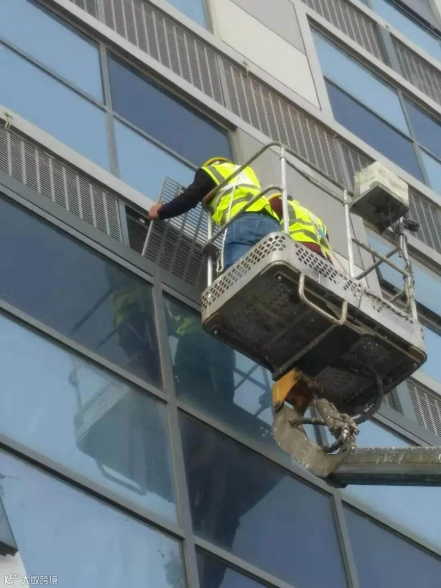 ①乘悬臂吊车,凿开砼与铝合金饰扳缝,清理干净;