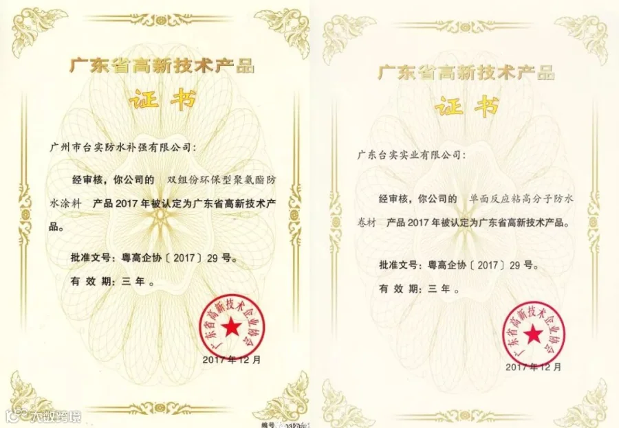 3月14日台实“双组份环保型聚氨酯防水涂料”和“单面反应粘高分子防水卷材”双双荣获的“广东省高新技术产品”证书下发到企业,这份殊荣是对台实产品的肯定,沉甸甸的值得台实人骄傲!