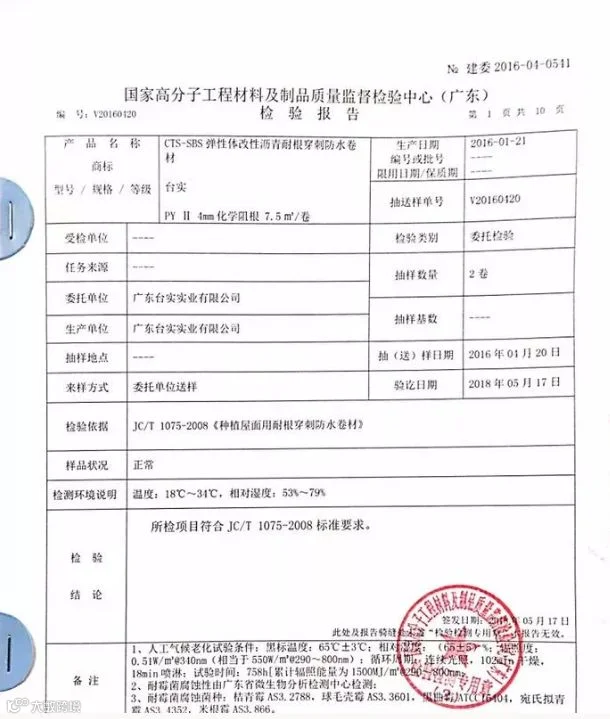 5月17日,台实防水品牌的重点产品《4.0mmSBS弹性体改性沥青耐根穿刺防水卷材》于国家高分子工程材料及制品质量检测检验中心历时两年严格的耐根穿刺项目检测,技术指标全部符合标准要求!将为全国种植屋面的防水工程提供优质、全面的防水保障。