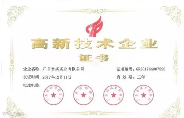 5月10日,从广东省科技厅传来喜讯,广东台实实业有限公司获得四部委认证,荣获 国家“高新技术企业”荣誉称号。近年来台实在产品技术研发和创新上不断加大投入,实力支撑是台实最强大的后盾,此次获颁国家“高新技术企业”证书当之无愧。